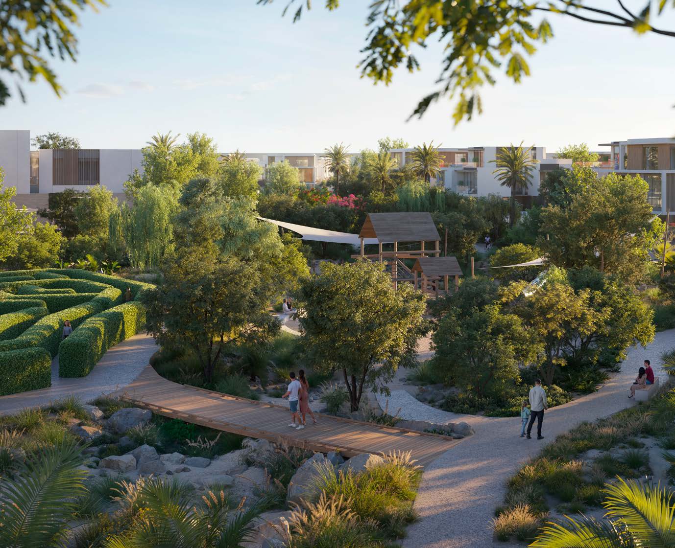 The Acres by Meraas features the Halo Loop Park, Lost Garden, and an Edible Garden, with 28% of the community dedicated to open, green space.